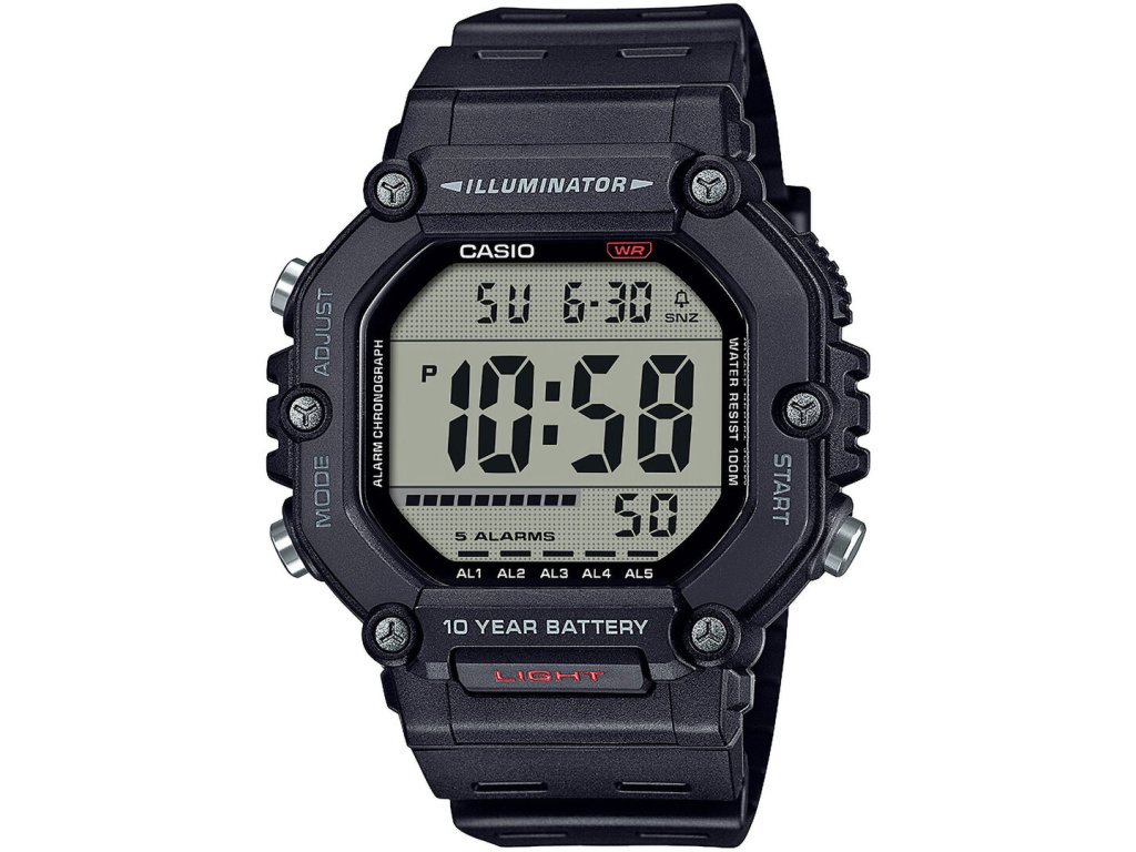 Pánské hodinky Casio AE 1600H-1A, digitální, na pryžovém řemínku, vodotěsnost 100M, životnost baterie 10 let. Disponují režimem 12/24, alarmem-5x multi alarm, stopkami, datumovkou, automatický kalendář a vodotěsností 100M.