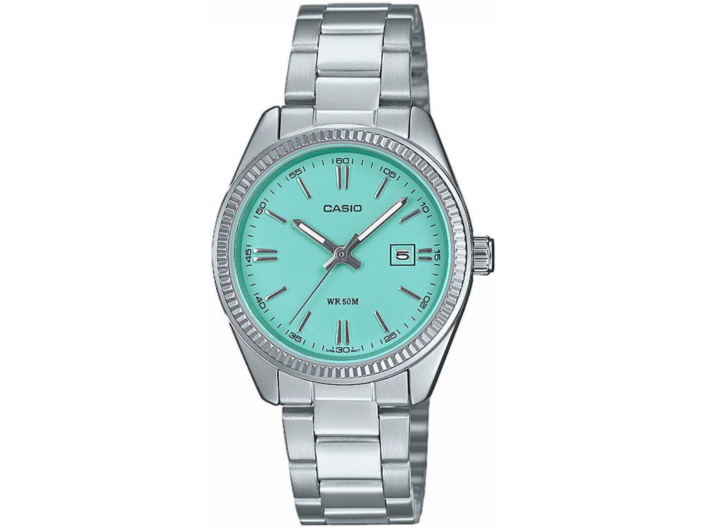 Dámské hodinky Casio LTP-1302PD-2A, kulatého tvaru, na kovovém tahu s výraznými symboly a jednoduchou datumovkou..