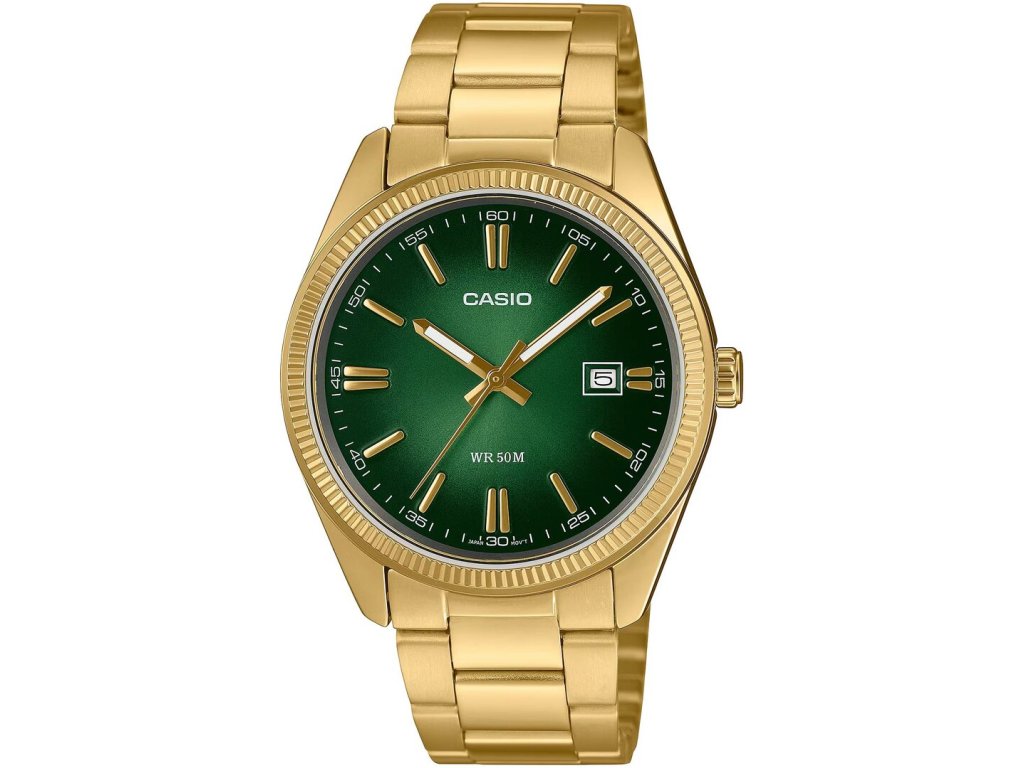 Pánské hodinky Casio MTP 1302PGC-3A kulatého tvaru na kovovém tahu s jednoduchou datumovkou a zdobenou lunetou.