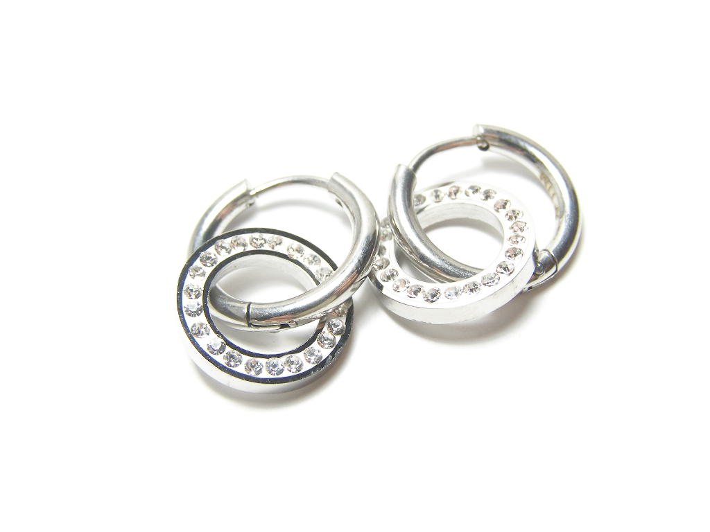 Ocelové visací náušnice kruhy se zavěšeným kruhem s krystaly, průměr náušnice 14mm, průměr zavěšeného kroužku 9mm.