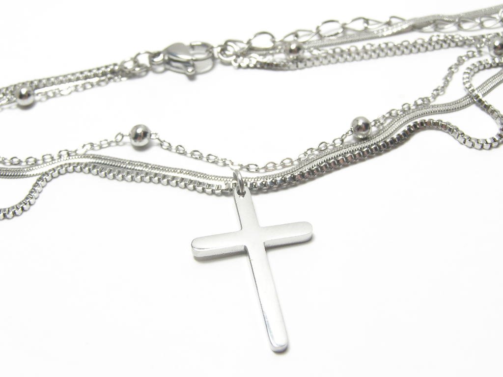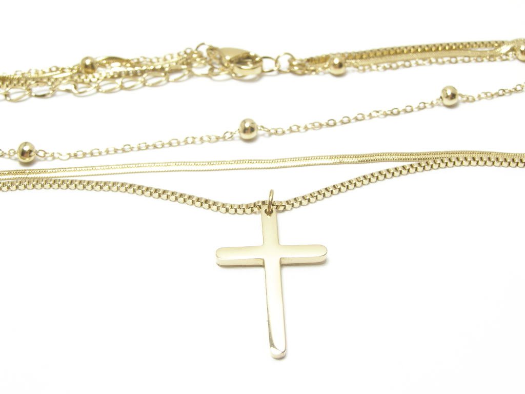 Ocelový trojitý řetízek s křížkem. Délka řetízku 42-50cm, rozměr křížku 22mmx14mm, i v pozlacené variantě.