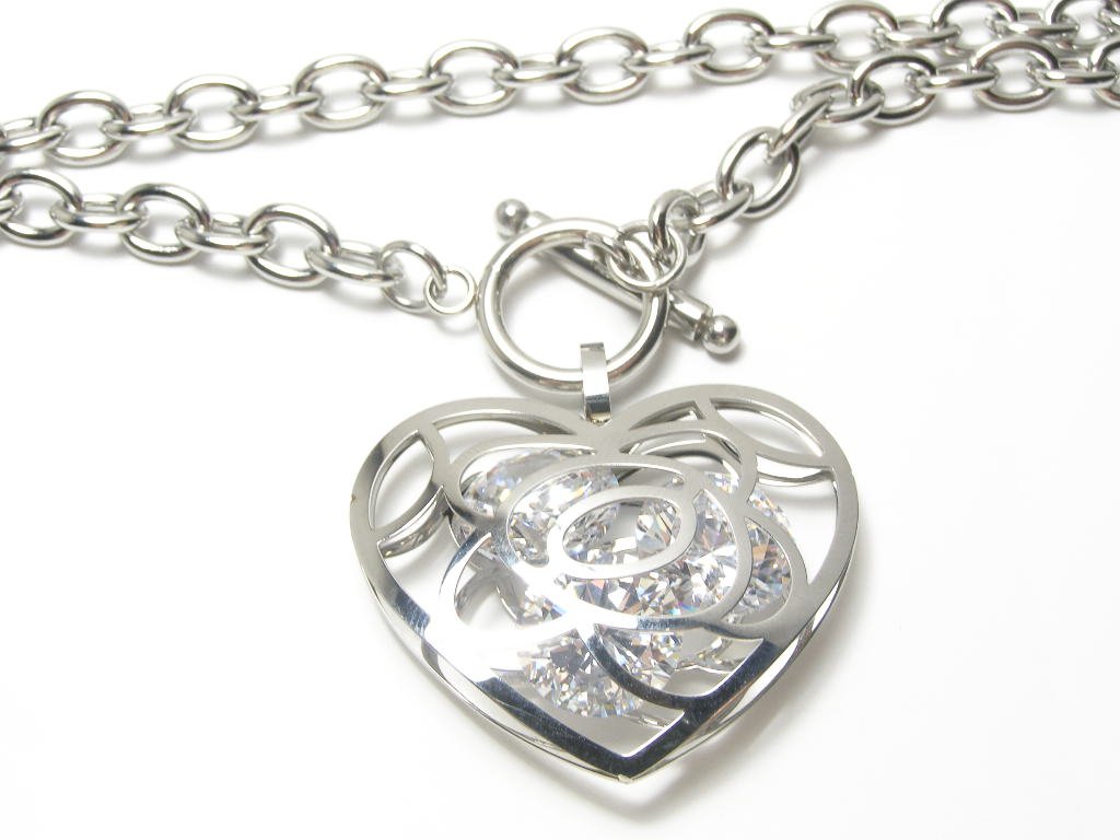 Ocelový mohutný náhrdelník se srdíčkem s krystale . Délka řetízku 45cm, rozměr přívěsku 32x30mm.