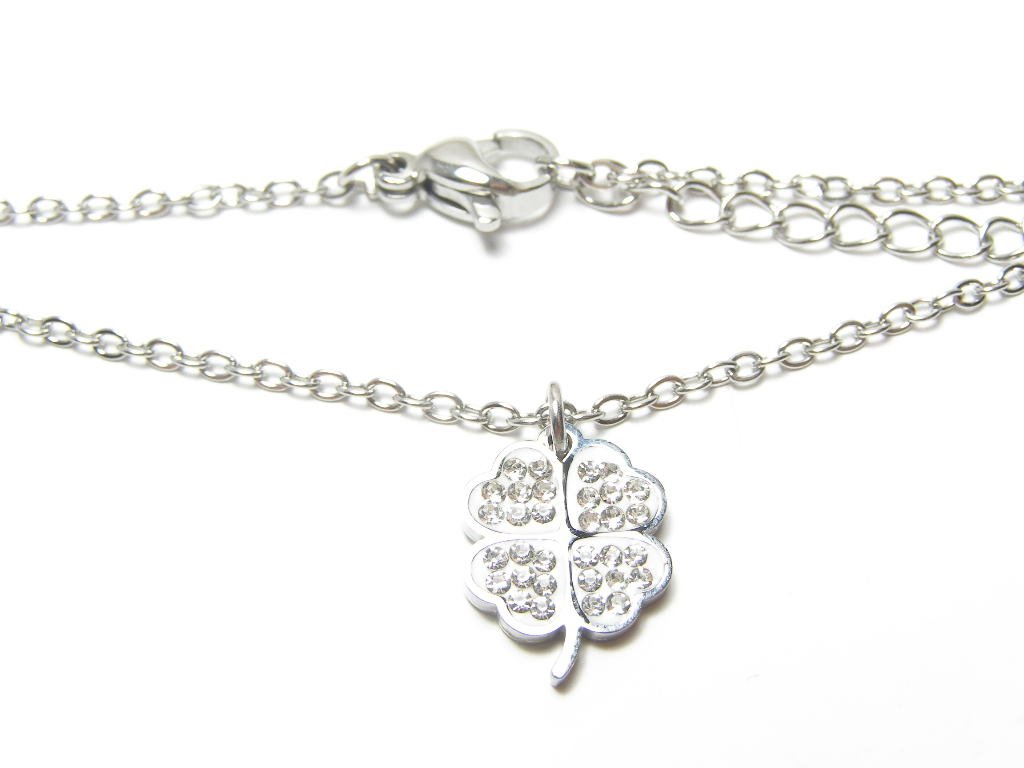Ocelový náhrdelník s přívěskem čtyřlístkem. Délka jemného řetízku 42-47cm, rozměr přívěsku 11x11mm.