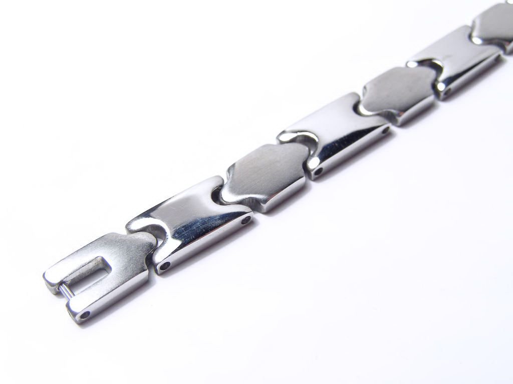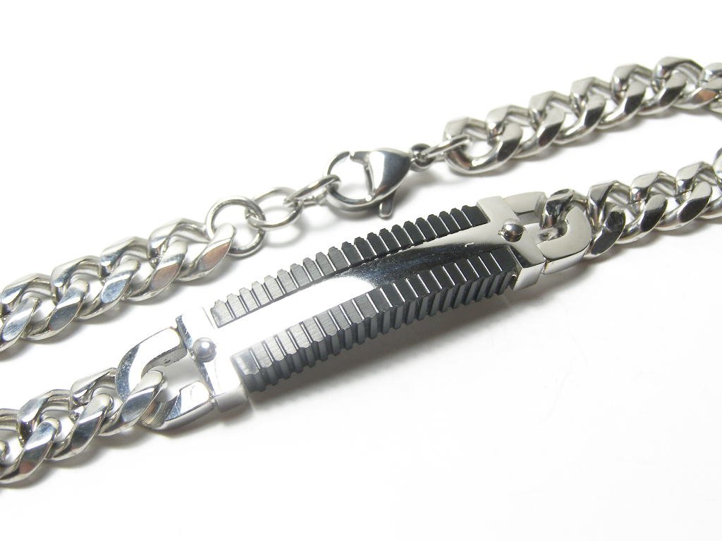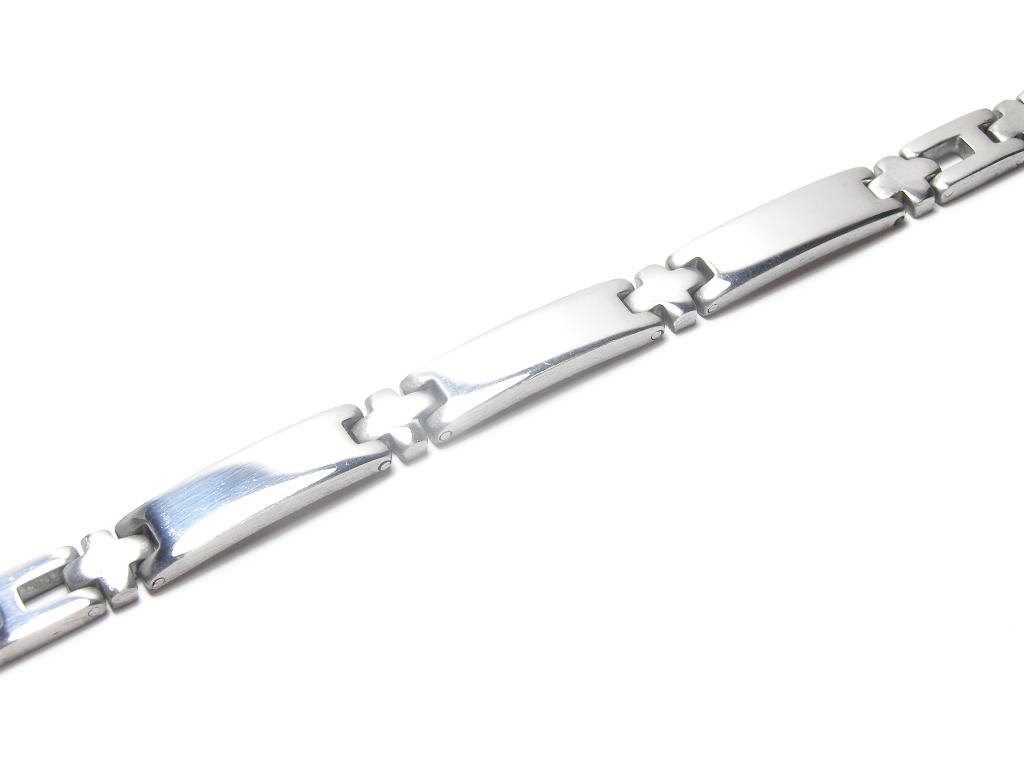 Ocelový náramek s destičkou uprostřed, délka 20cm, šířka 8mm.