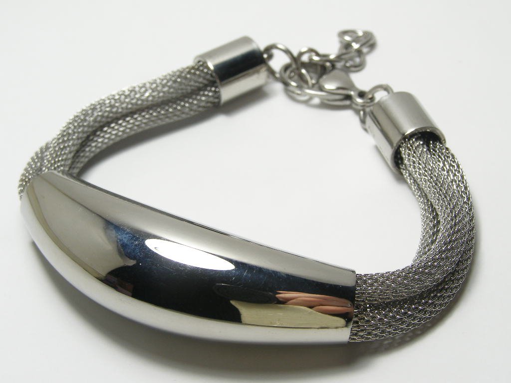 Ocelový náramek složený ze tří lanek a středového hladkého válce, délka náramku až 23cm, šířka až 15mm.