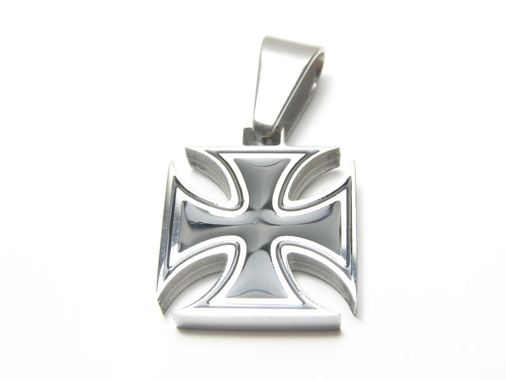 Ocelový přívěsek ve tvaru kříže-maltézský, hladký, jednoduchý, kombinovaný uprostřed s PVD. Rozměr bez ouška 20x20mm.