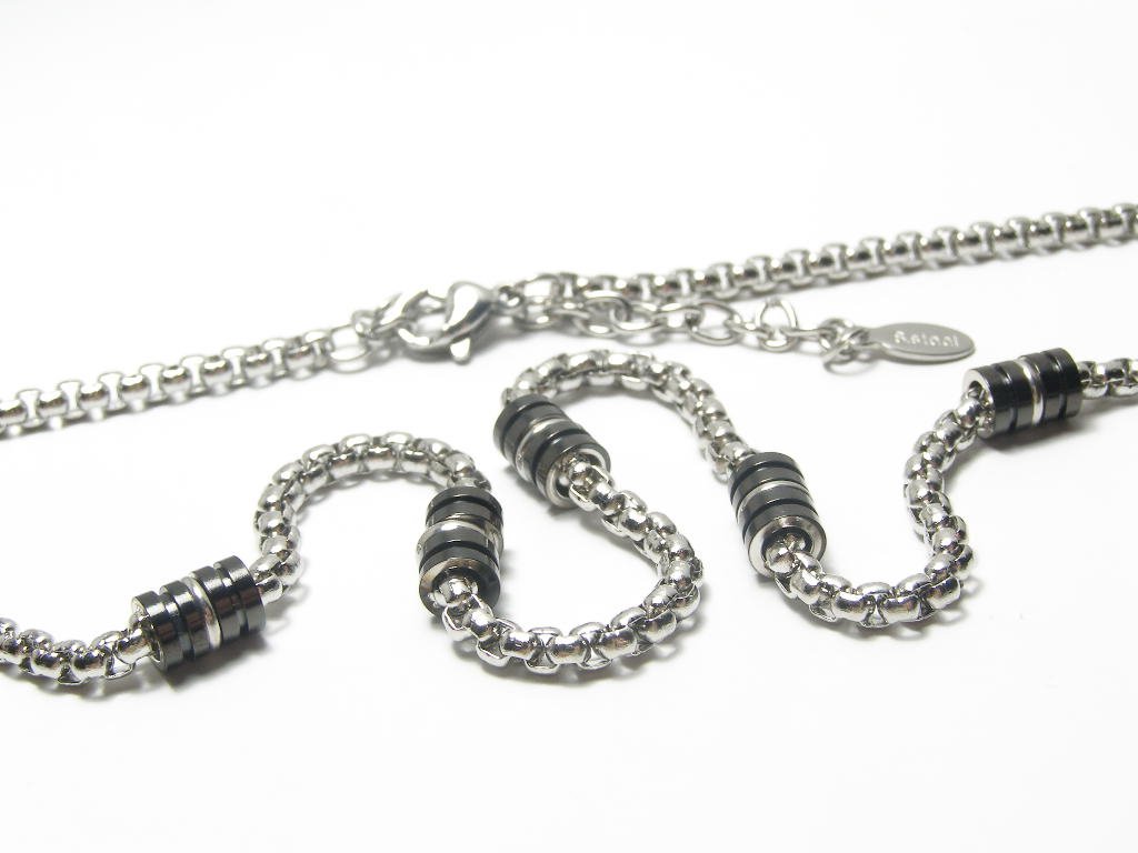 Ocelový řetízek ozdobený 5-ti válečky, délka 55+5cm, šířka 3mm, rozměr válečku 7x4mm.