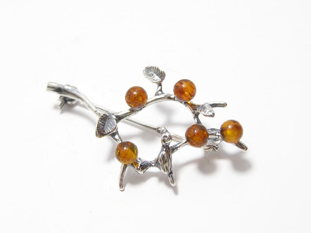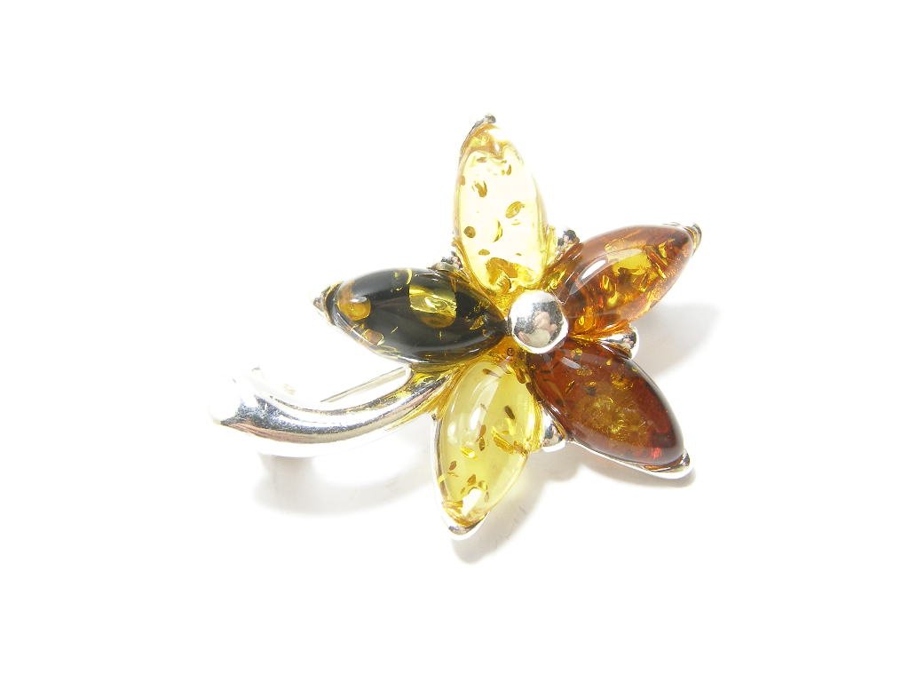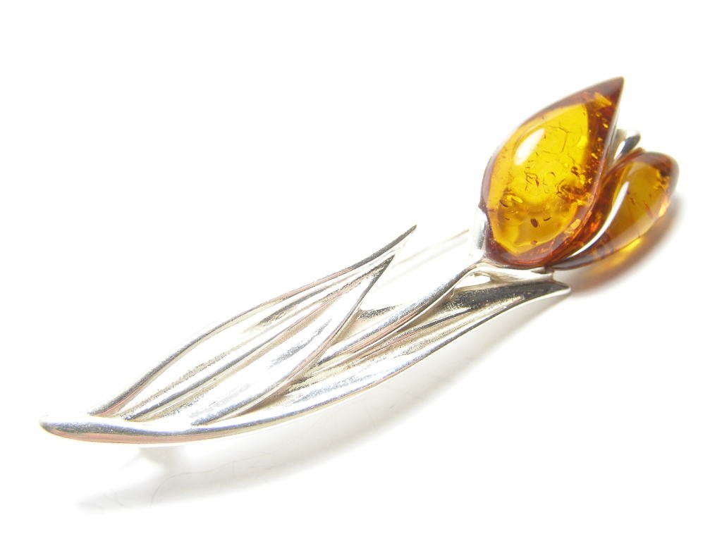 Stříbrná brož-tulipán s jantary, rozměr 55x13mm.