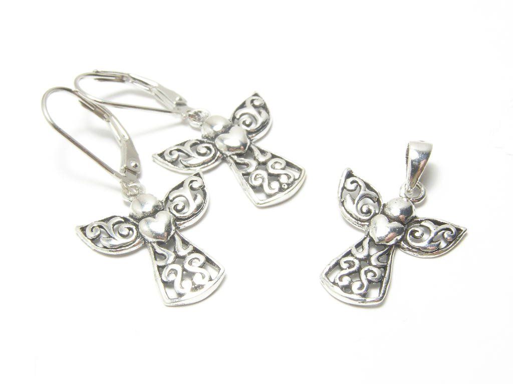 Stříbrný komplet-visací náušnice na klasické zapínání ve tvaru andělíčka, šířka náušnice 15mm, délka 32mm, přívěsek - šířka 15mm, délka 20mm.