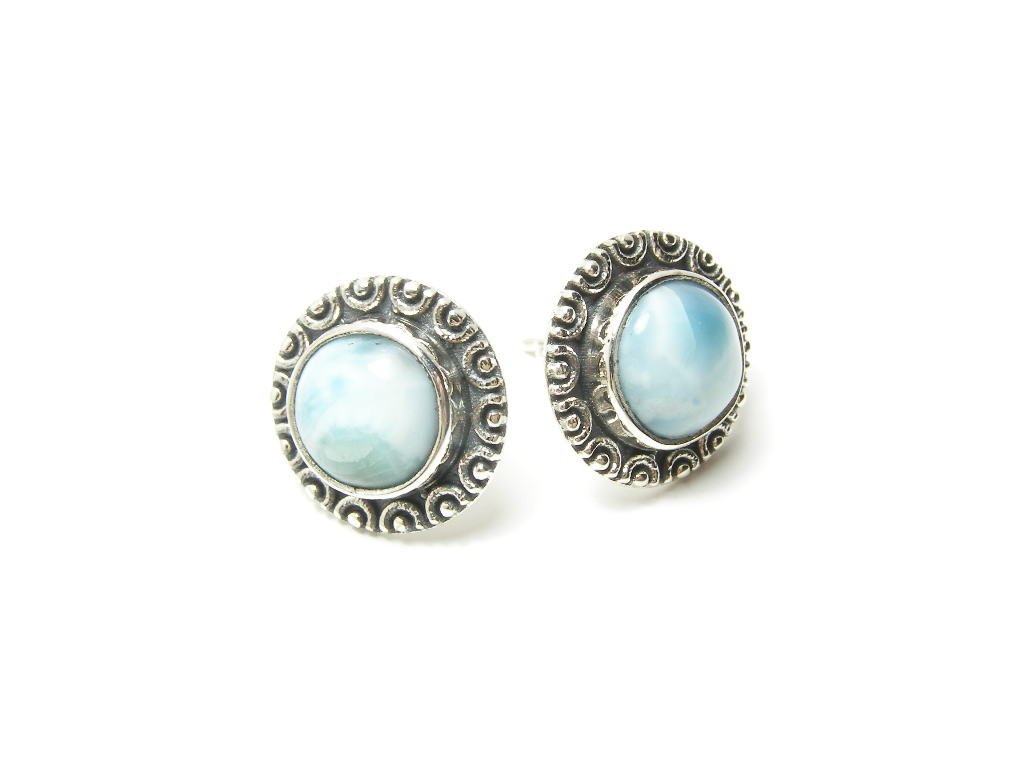 Stříbrné náušnice-pecičky s Larimarem v krásné zdobné obrubě. Průměr náušnice 13mm. Zapínání na puzetu.