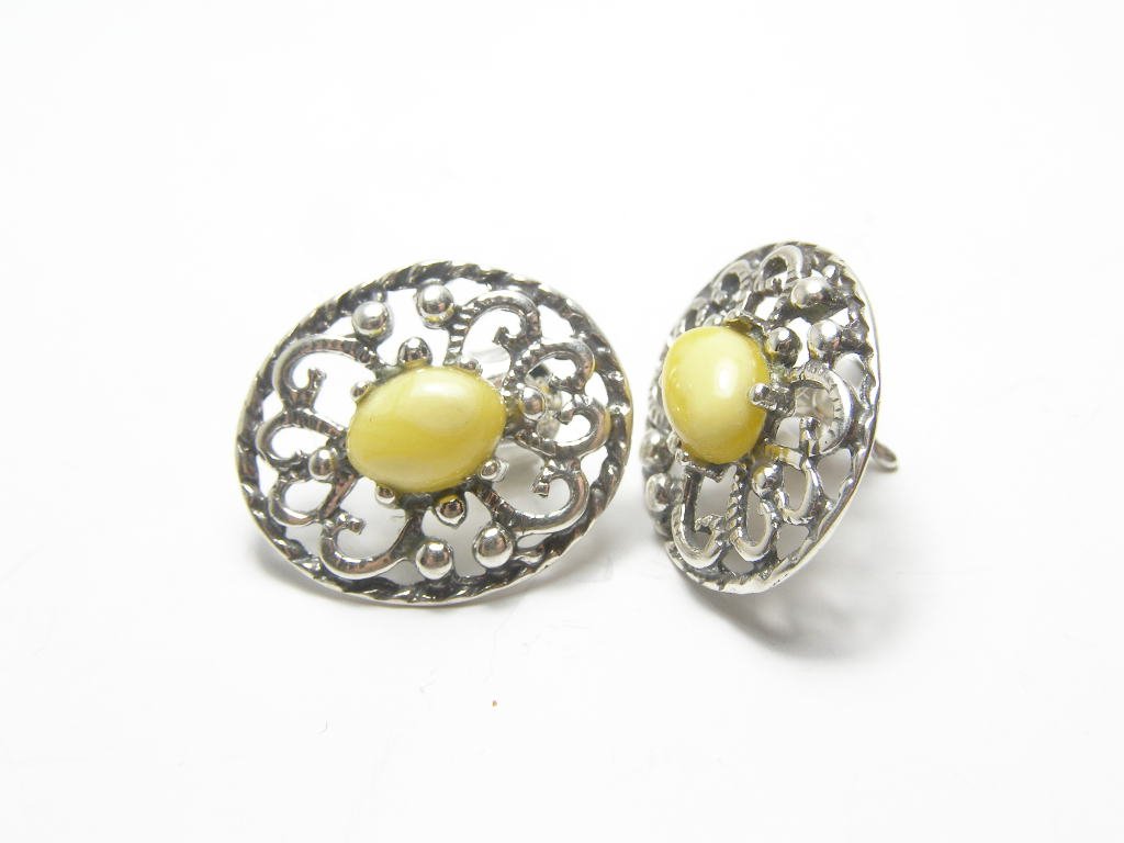 Stříbrné náušnice kombinované s jantarem, zapínání na puzetu, oválný jantar zafasovaný ve starostříbrné obrubě, průměr náušnice 17mm.