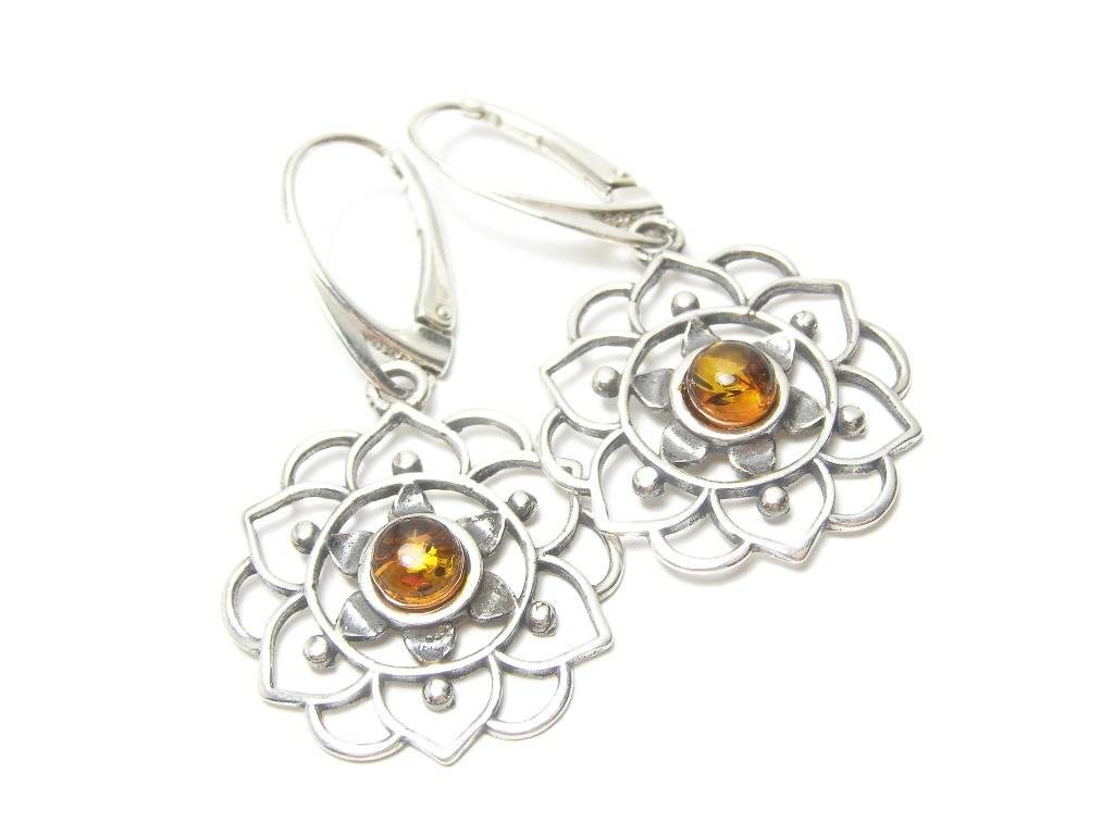 Stříbrné náušnice kombinované s jantarem na klasické zapínání-klapku, kulatý jantar zafasovaný v ozdobné obrubě, šířka náušnice 20mm, délka 42mm.