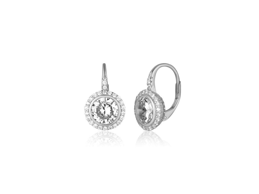 Stříbrné náušnice poseté malými zirkonky kolem středového kulatého krystalu, délka náušnice 15mm, šířka 10mm, zapínání na klasický patent.