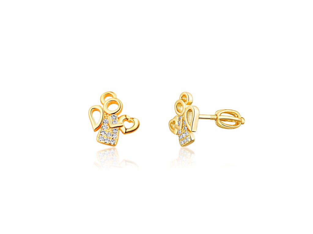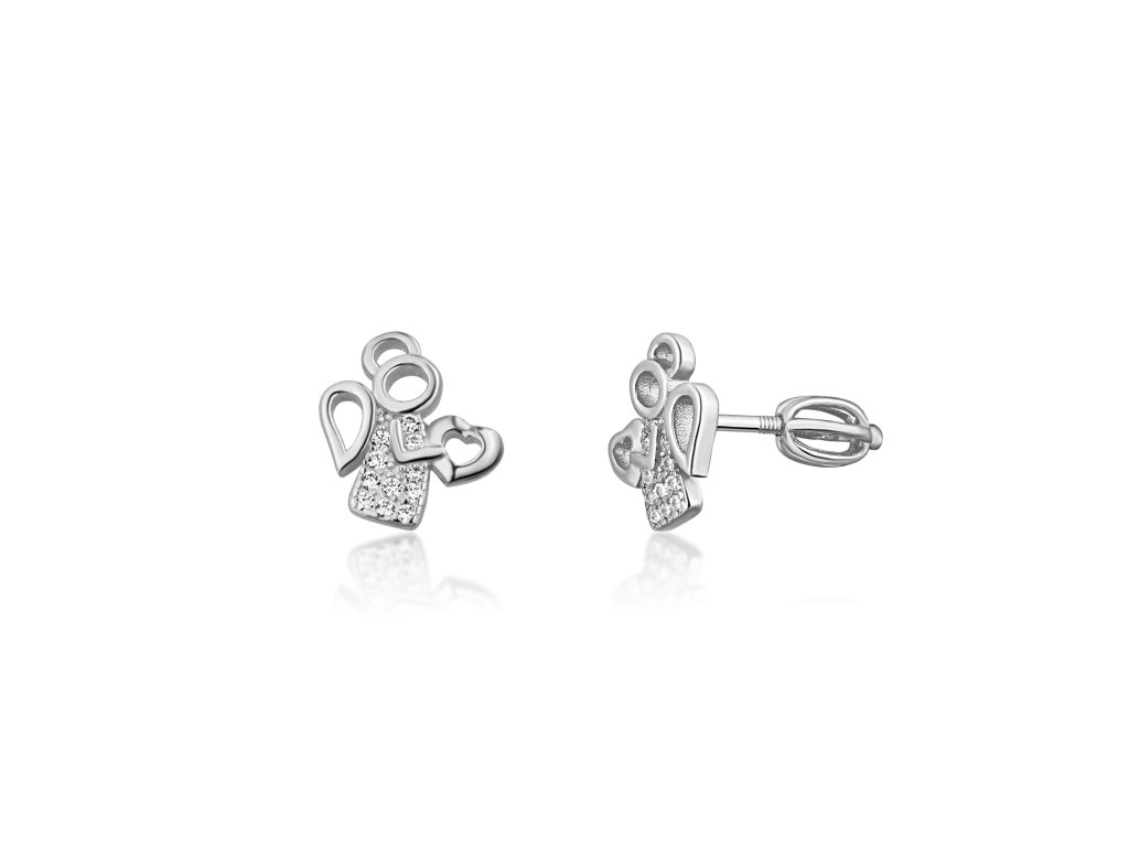 Stříbrné náušnice s bílými zirkony ve tvaru andílka, rozměr 10x11mm, na šroubek, i v pozlacené variantě.