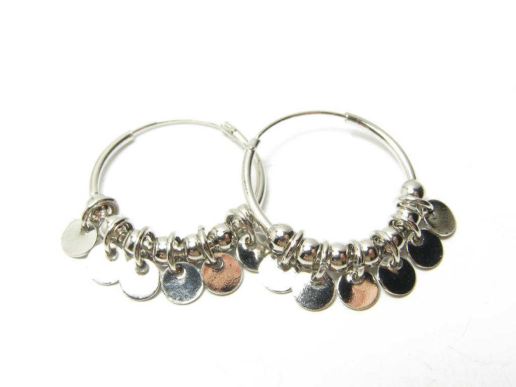 Stříbrné náušnice se zapínáním do dutinky s přívěsky-penízky, šířka náušnice 1mm, průměr náušnice 18mm, průměr kolečka 3mm.