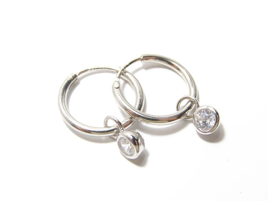 Stříbrné náušnice na francouzské zapínání s přívěskem zirkonem v hladké obrubě, šířka náušnice 1mm, průměr náušnice 14mm, průměr přívěsku 4mm.
