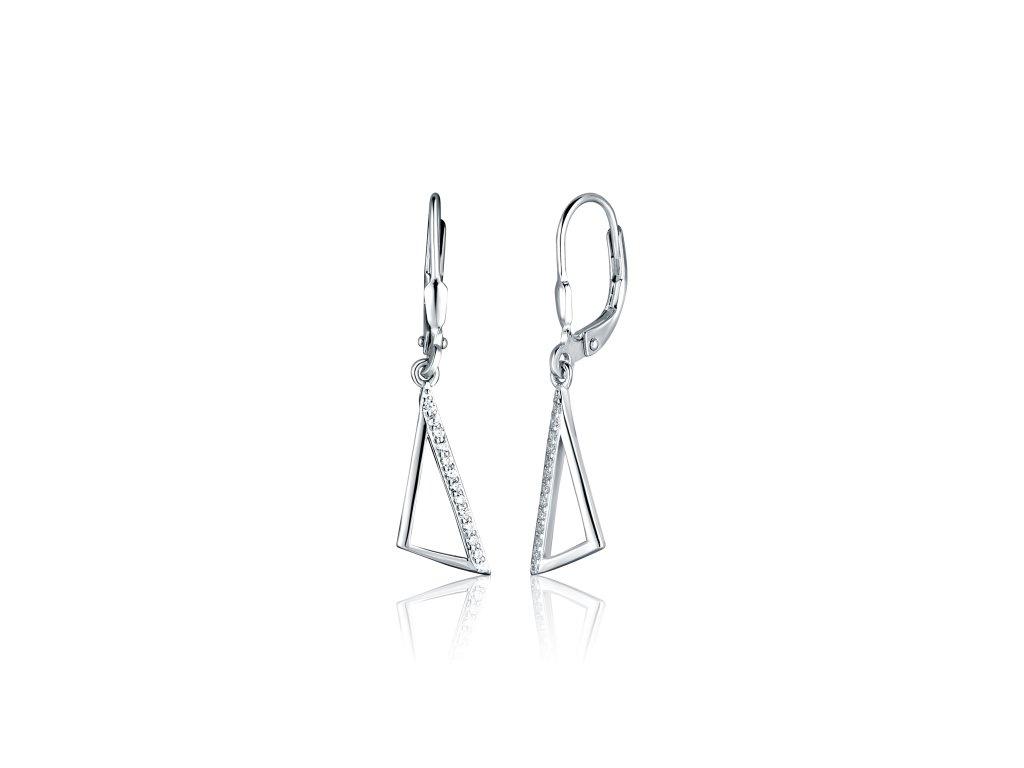 Stříbrné visací náušnice na klasické zapínání, ozdobná zavěšená část ve tvaru trojúhelníku, poseté bílými zirkony, délka náušnice vč.zapínání 35mm, šířka 7mm.