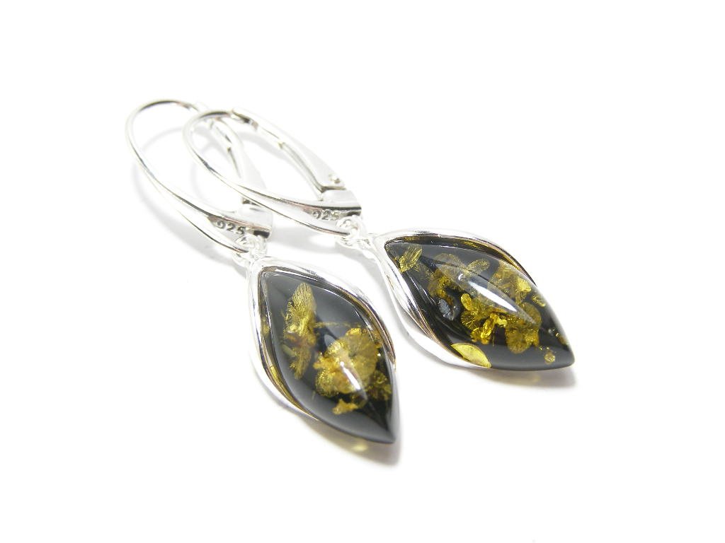 Stříbrné náušnice kombinované s jantarem-tvar slzy, zapínání na klapku, oválný jantar zafasovaný v hladké obrubě, šířka náušnice 8mm, délka 38mm.