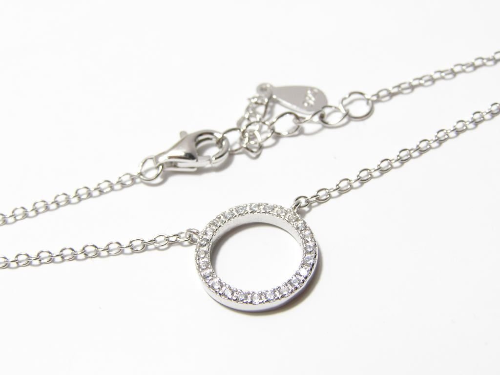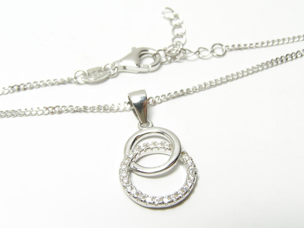 Stříbrný dámský náhrdelník uprostřed ozdobený obrysem kruhů se zirkony. Nastavitelná délka 42-45cm. Průměr kruhů 10 a 7mm.