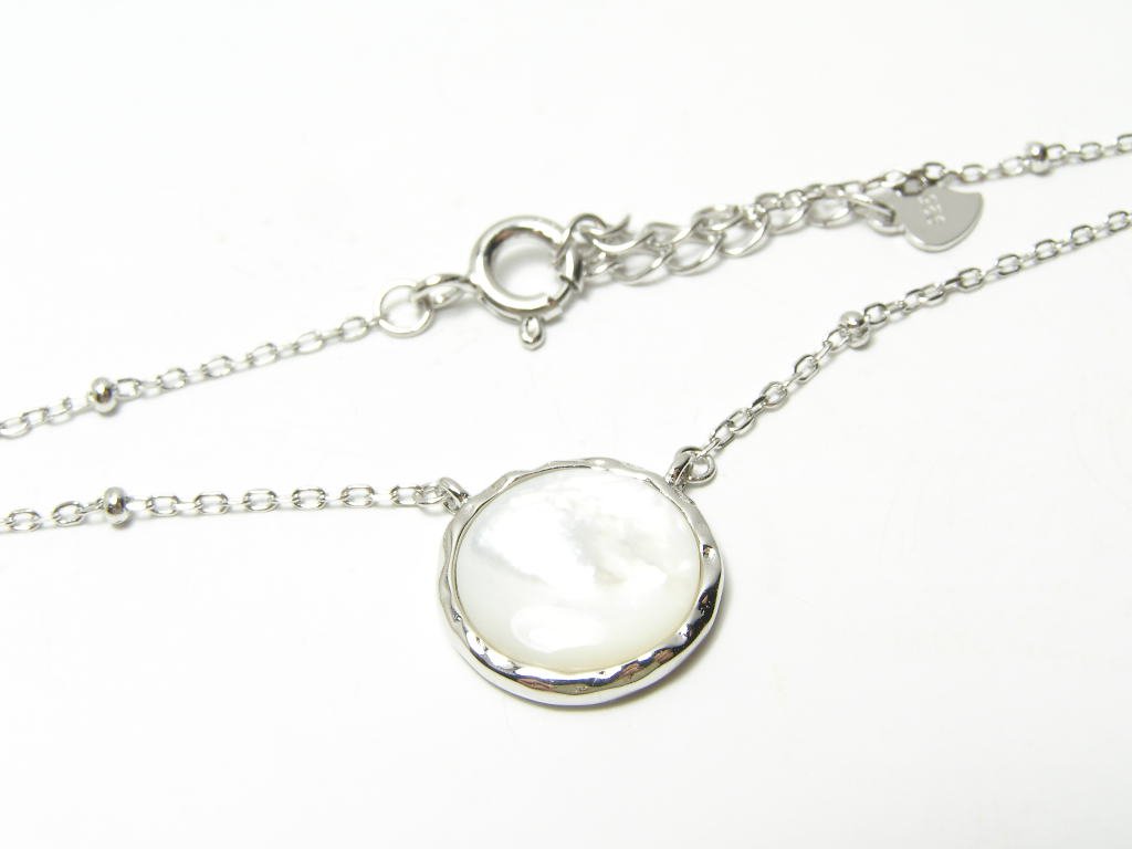Stříbrný dámský náhrdelník uprostřed ozdobený kroužkem s perletí. Nastavitelná délka 42-45cm. Průměr kruhu 11mm.