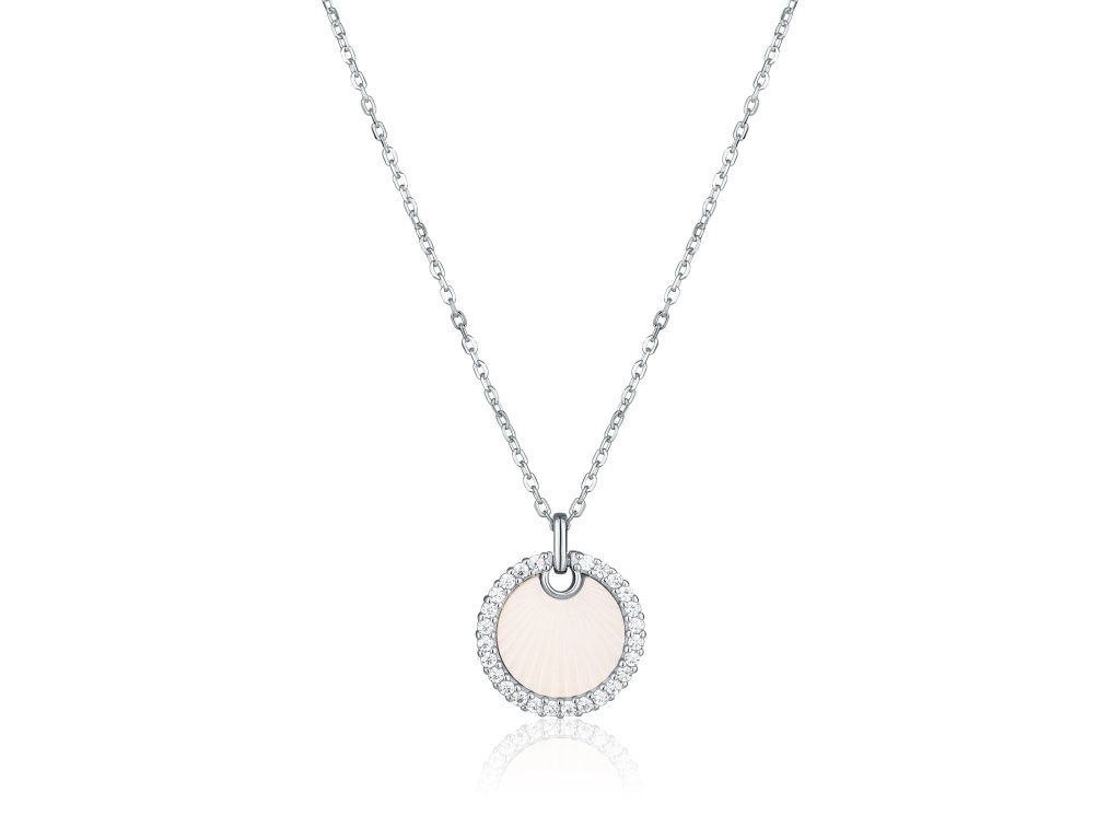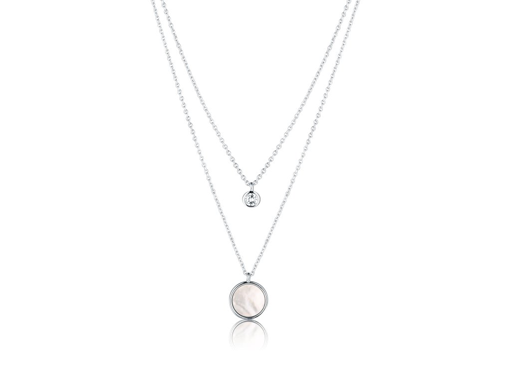 Stříbrný dámský zdvojený náhrdelník uprostřed ozdobený kulatým přívěskem a perletí v kulatém tvaru. Nastavitelná délka 45cm. Průměr přívěsku 11mm a zirkonu 5mm.