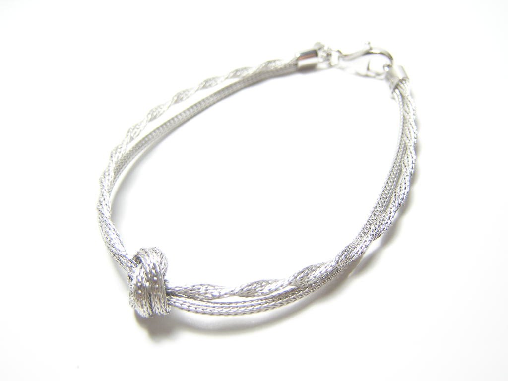 Stříbrný náramek - dvě kulatá lanka, uprostřed ozdobená uzlem. Povrchová úprava patinou, velmi efektní. Délka náramku 19cm, šířka v nejširším bodě 12mm.