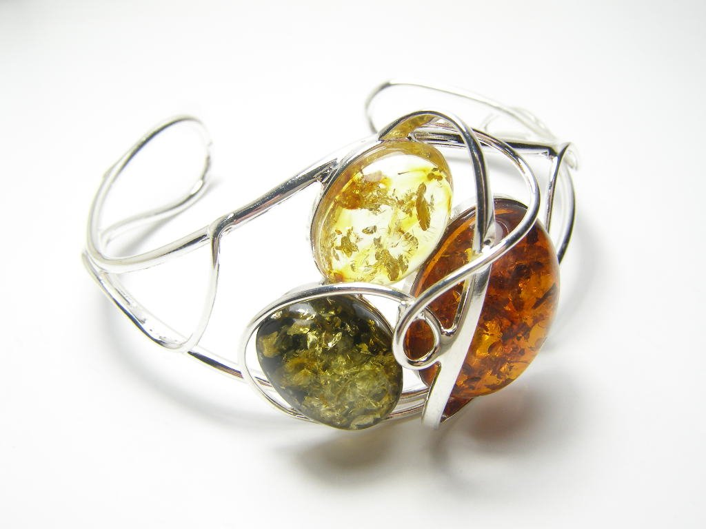 Stříbrný náramek kruh bohatě ozdobený oválnými jantary, průměr náramku 6cm, šířka v nejširším bodě 34mm.
