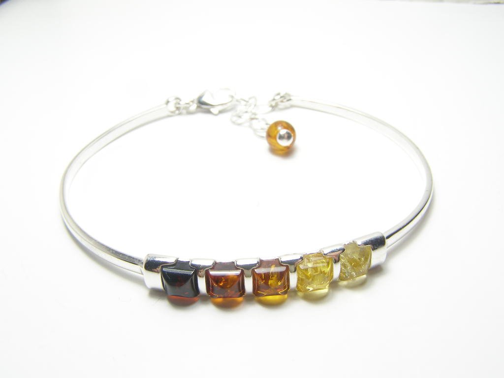 Stříbrný elegantní náramek kruh, ozdobený hranatými jantary (4x4mm), průměr náramku 6cm, šířka 6mm. Zapínání je řešeno do dutinky s pojistkou.