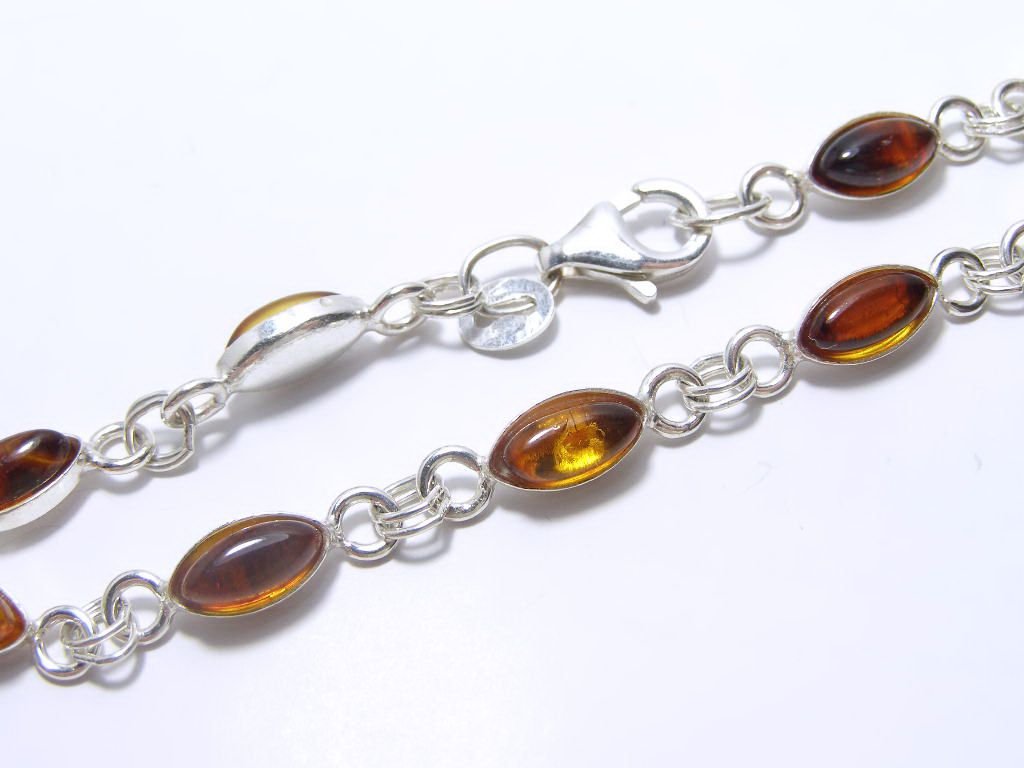 Stříbrný náramek, tvořený šesti jantarovými ovály v hladké obrubě, nastavitelná délka až 16-19cm, šířka 14mm.