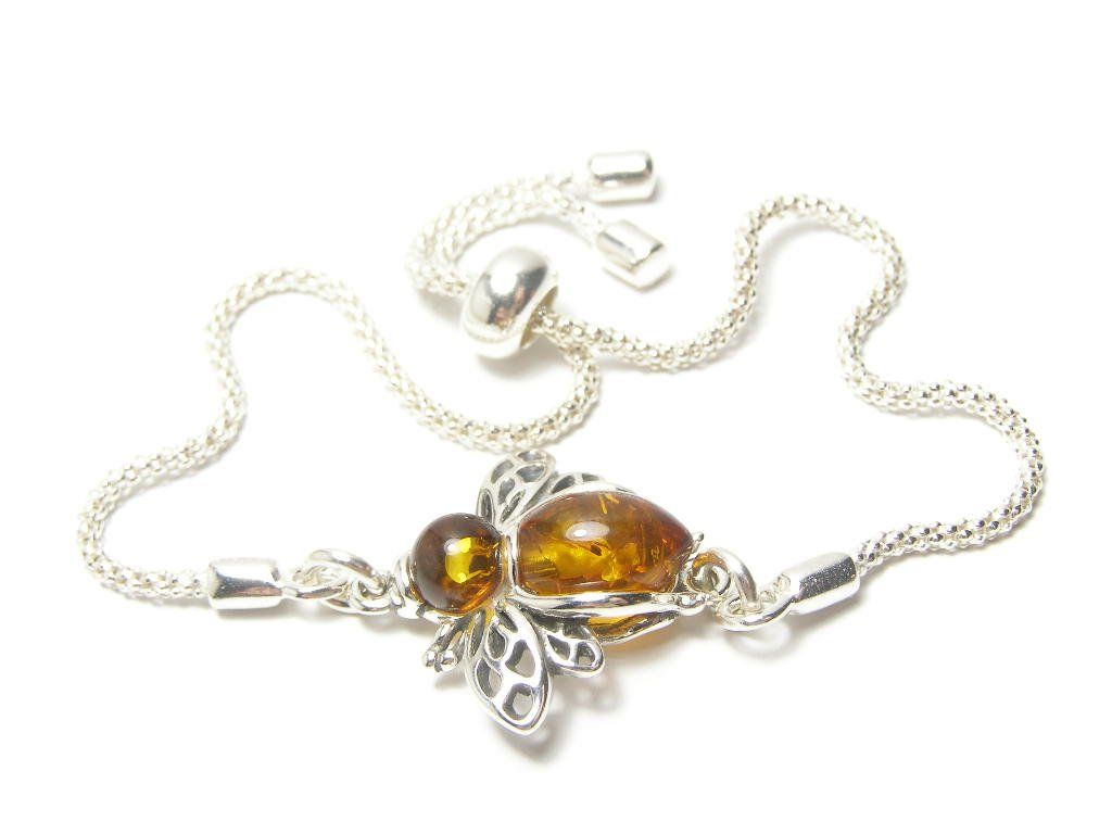 Stříbrný náramek tvořený jantary ve tvaru včely, v hladké obrubě, délka náramku je nastavitelná-na stáhnutí, rozměr včely 18x18mm.