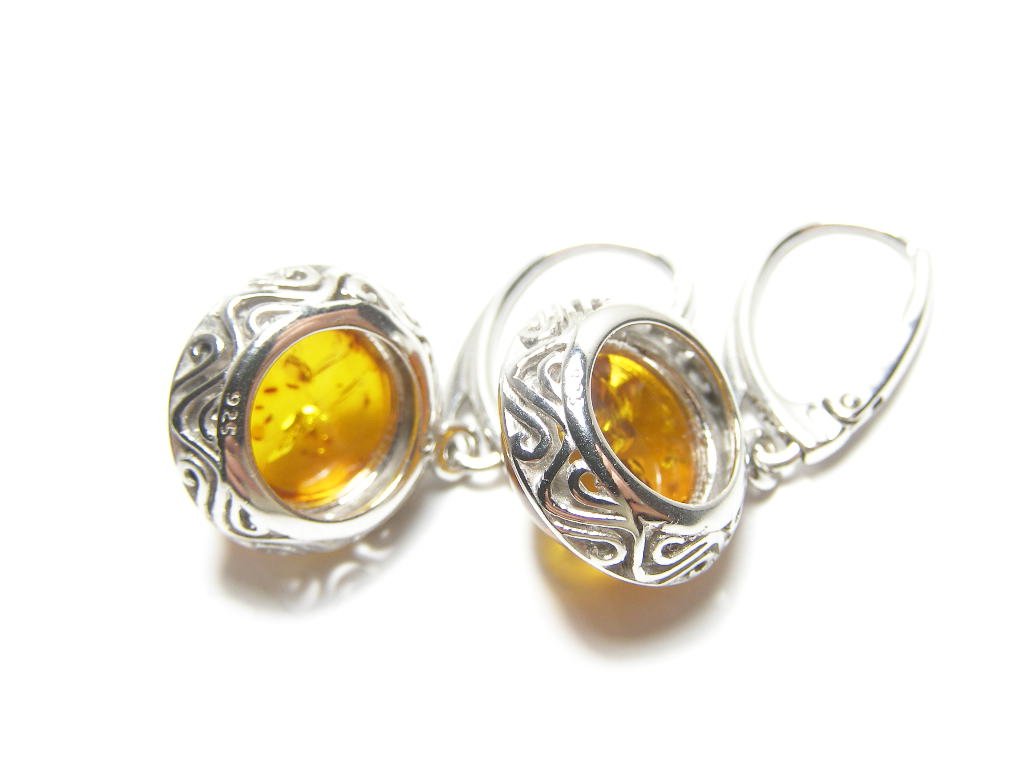 Stříbrný přívěsek jantar, zafasovaný do stříbrné kulaté ozdobné obruby, délka vč.závěsného ouška 35mm, šířka 20mm. Možnost kombinovat s náušnicemi NK00304.