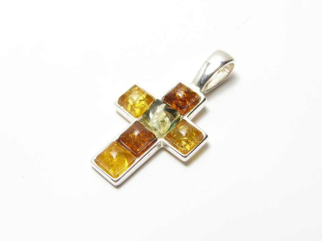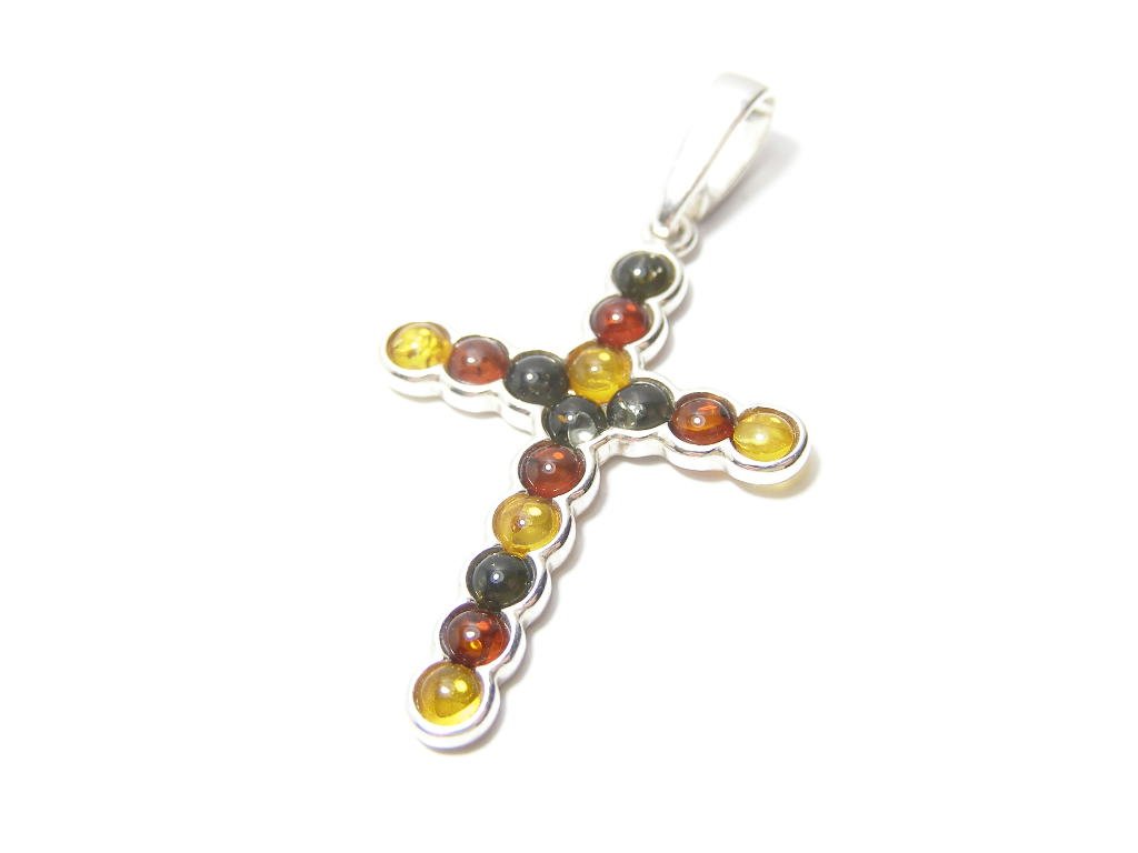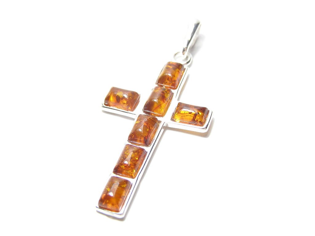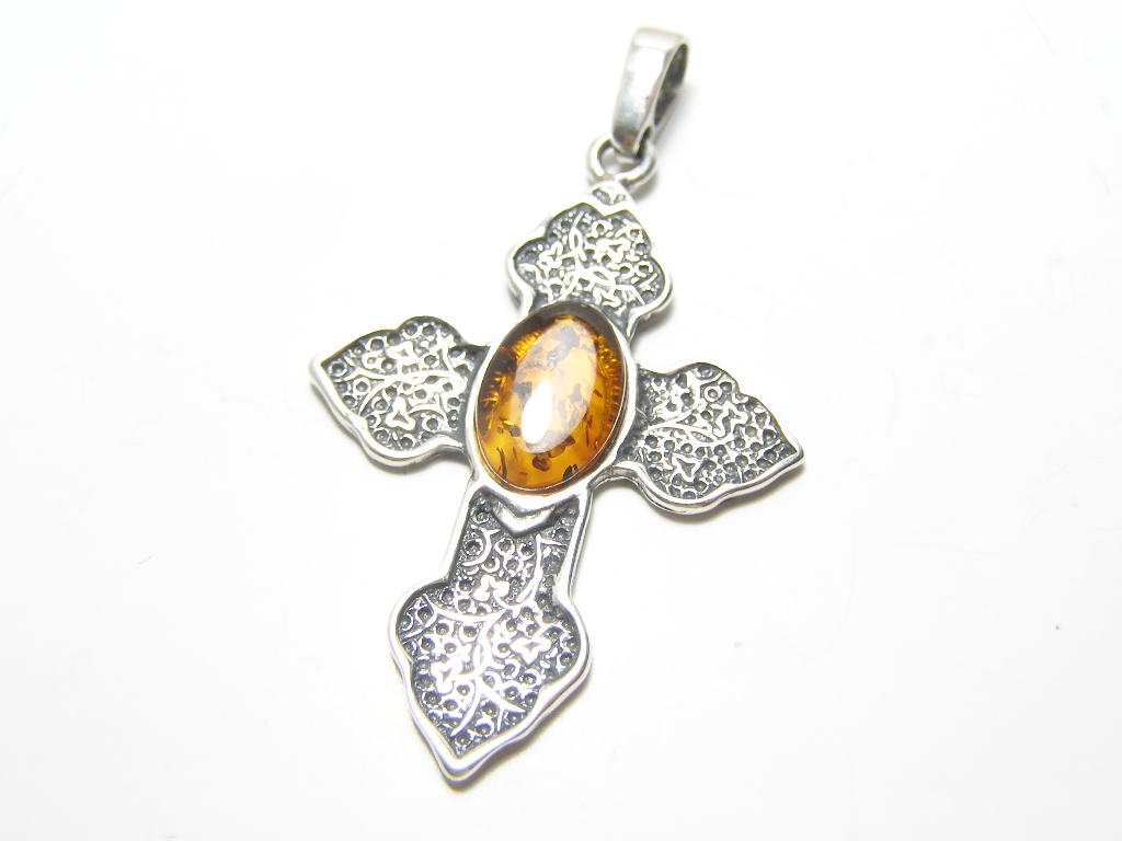 Stříbrný přívěsek jantar-tvar kříže ve starostříbrné obrubě, rozměr 50x26mm.