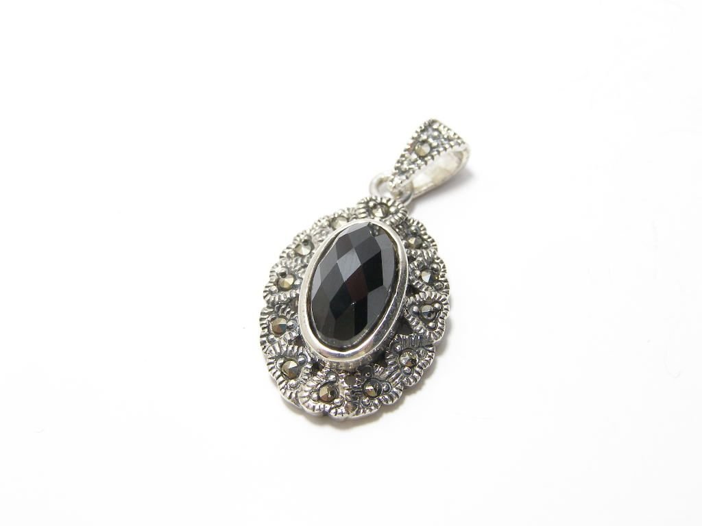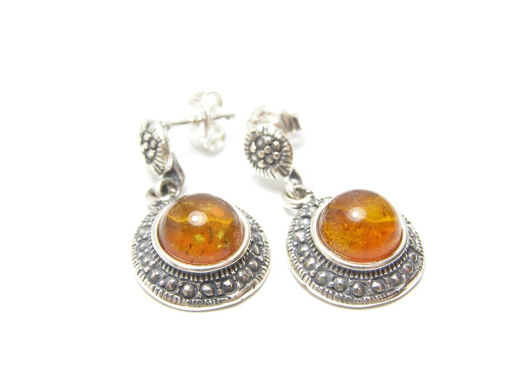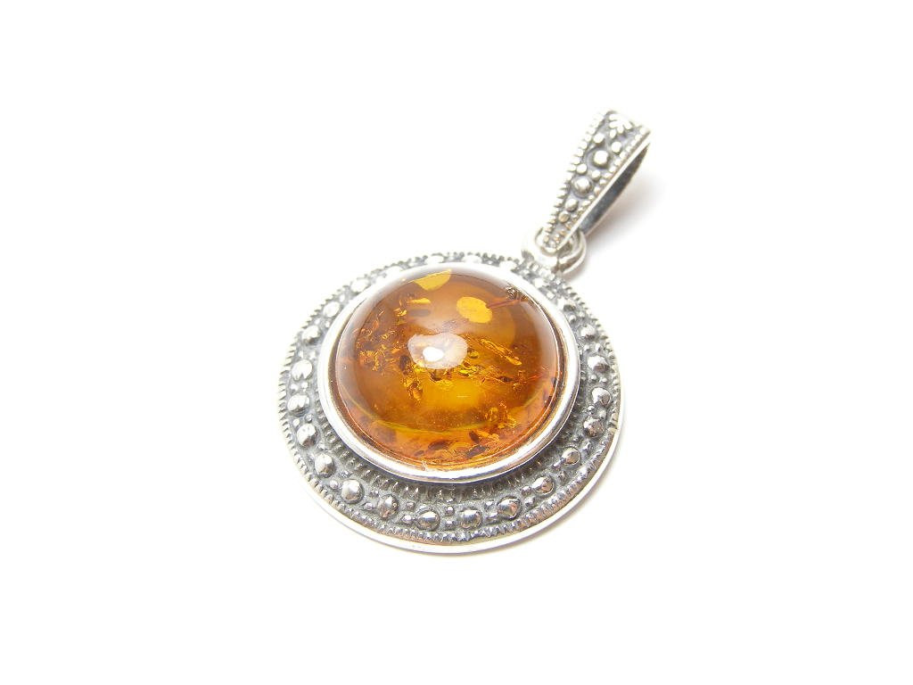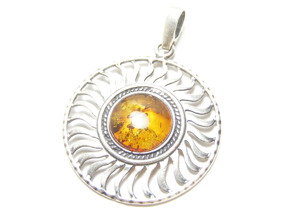 Stříbrný kulatý přívěsek ozdobený jantarem, průměr 30mm.