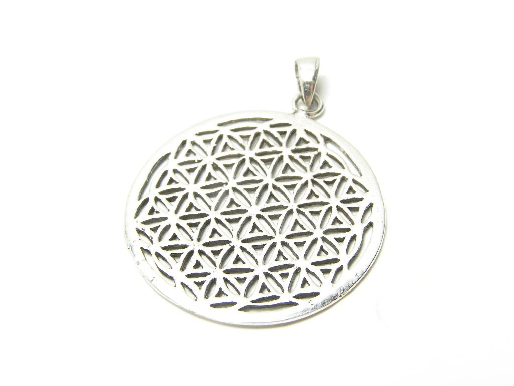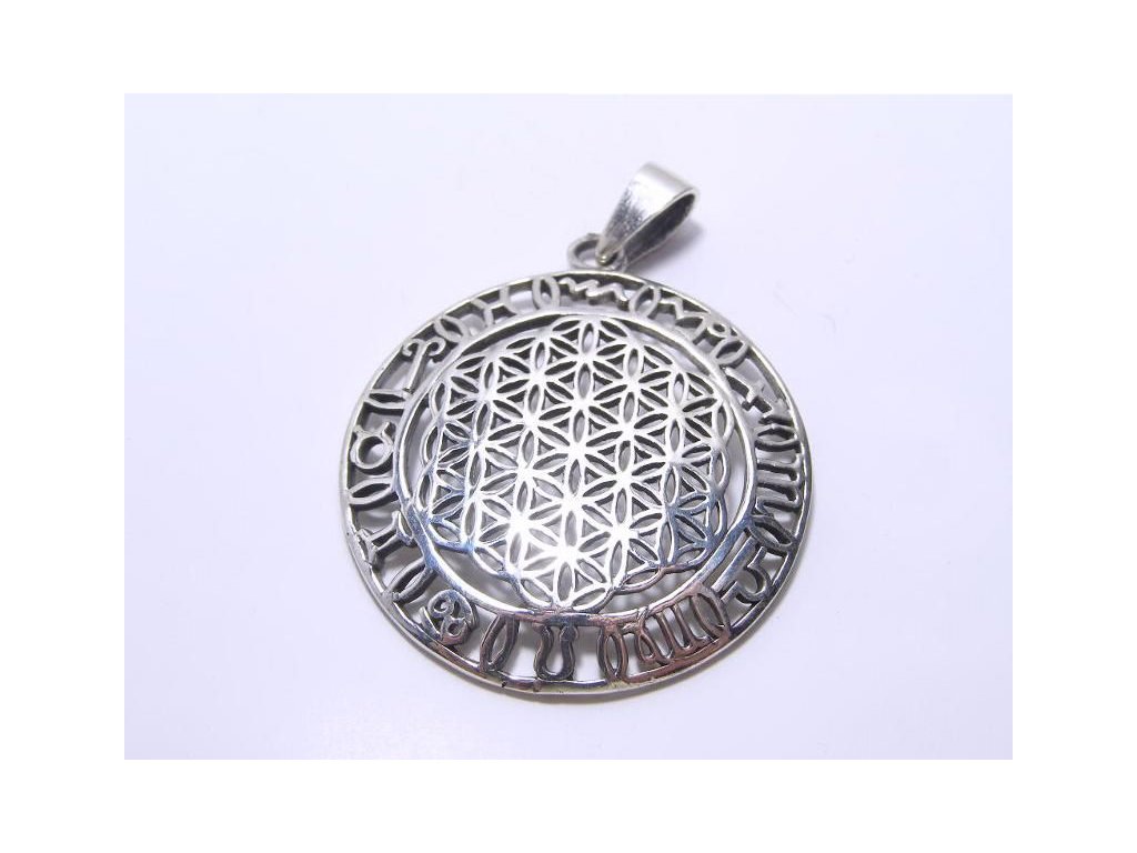 Stříbrný přívěsek - kulatý medailon "květ života" - ve starostříbrné úpravě, průměr 26mm s mohutným ouškem na masivnější řetízek nebo kůži.