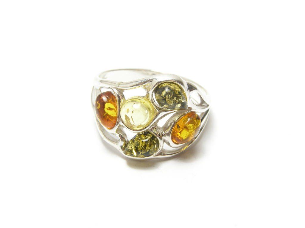 Stříbrný prsten s pěti oválnými jantary, vel. 59.