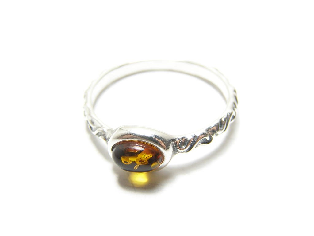 Stříbrný prsten s oválným jantarem v hladké obrubě, vel. 54. Šířka prstenu v nejširším bodě 4mm.