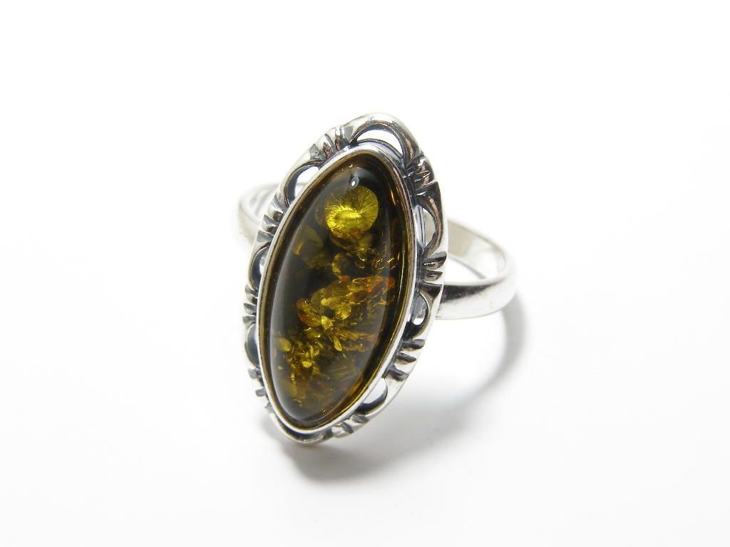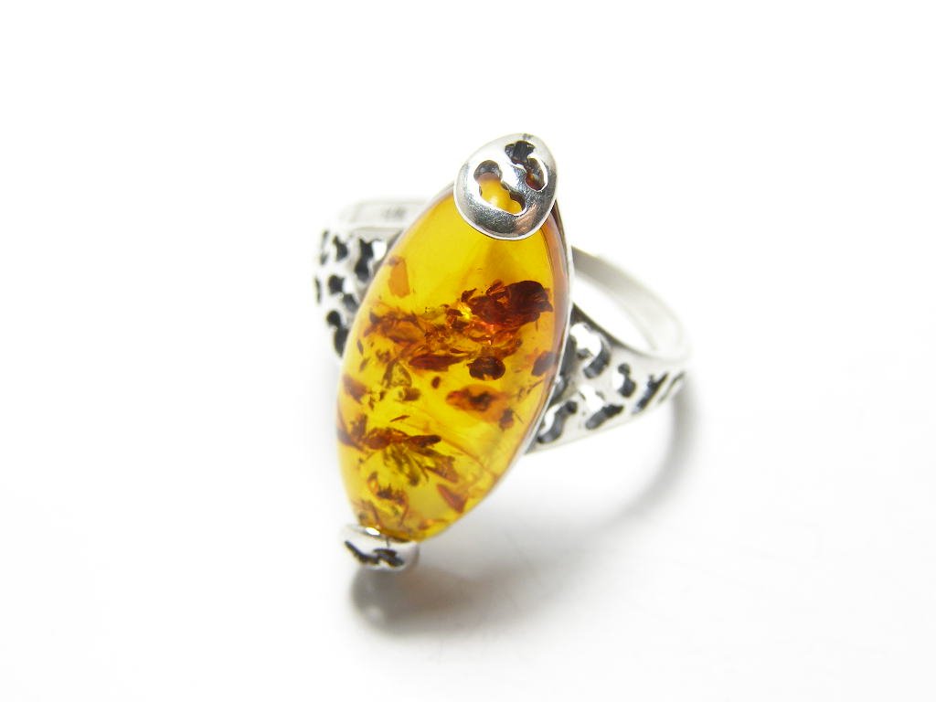 Stříbrný prsten s oválným jantarem v ozdobné patinované obrubě, vel. 60. Šířka prstenu v nejširším bodě 11mm, délka 22mm.