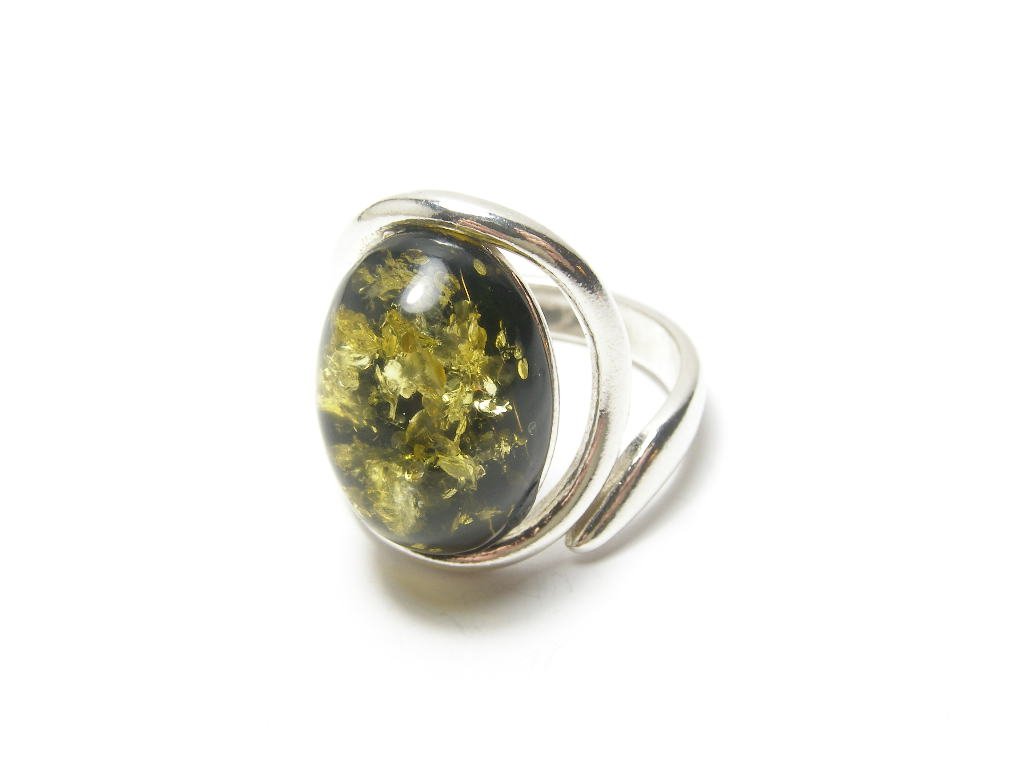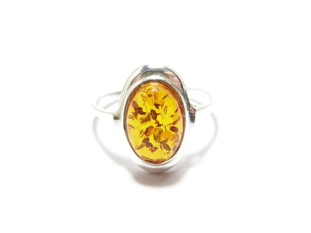 Stříbrný prsten s jantarem v hladké obrubě, vel. 57. Šířka prstenu v nejširším bodě 17mm.
