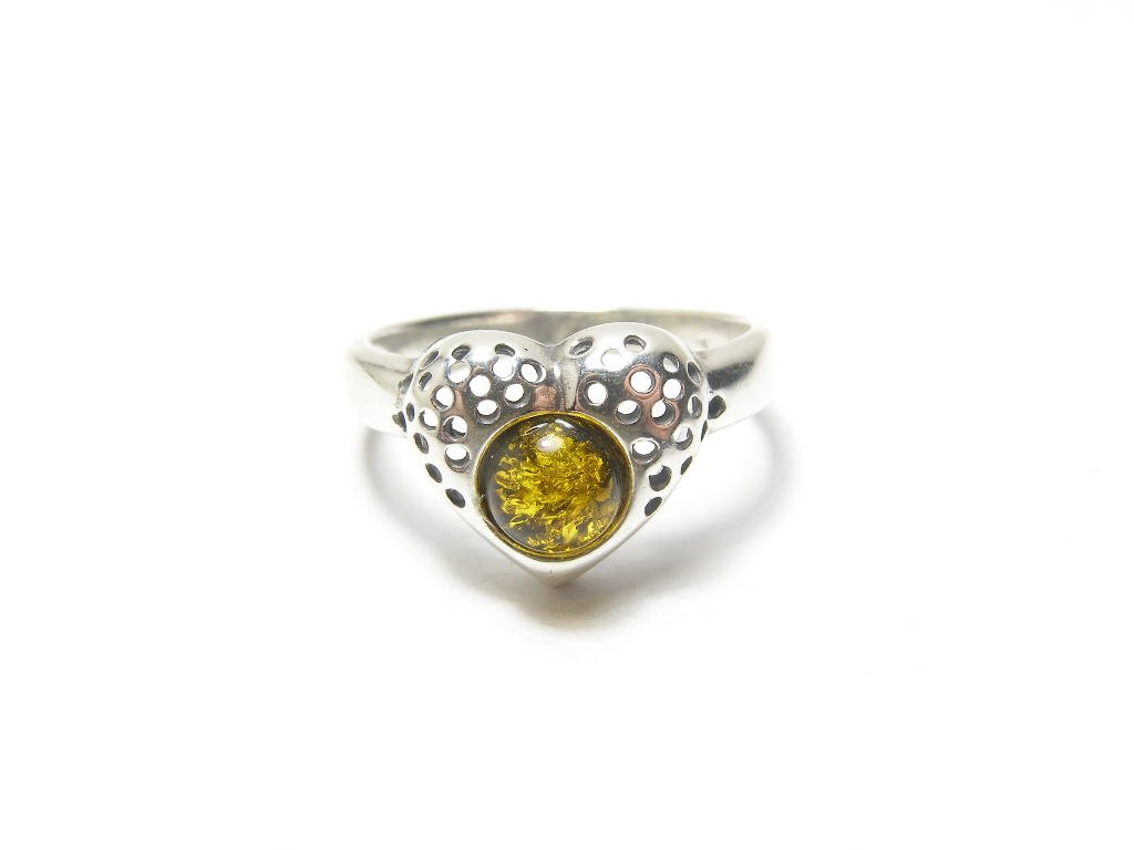 Stříbrný prsten s jantarem ve tvaru srdíčka, vel.55. Šířka prstenu v nejširším bodě11mm. Možnost kombinovat s náušnicemi NK01124.