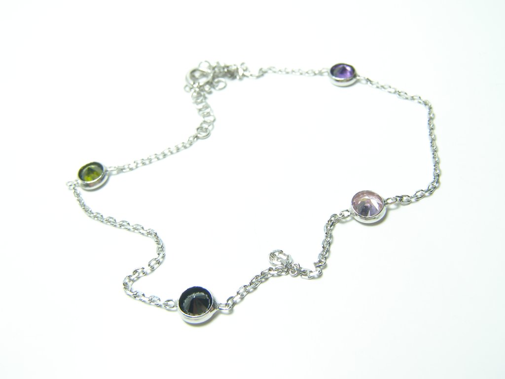 Stříbrný řetízek na nohu ozdobený barevnými zirkony, nastav.délka až 24cm.